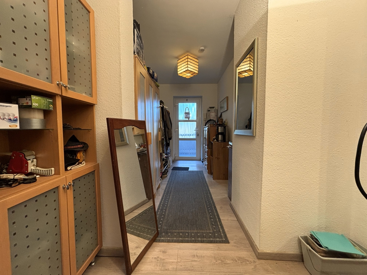 Über den Flur sind sowohl die separate Küche als auch das Badezimmer bequem erreichbar. Die Küche ist sinnvoll vom Wohnbereich getrennt, bietet ausreichend Platz zum Kochen und ist mit einem Waschmaschinenanschluss ausgestattet.