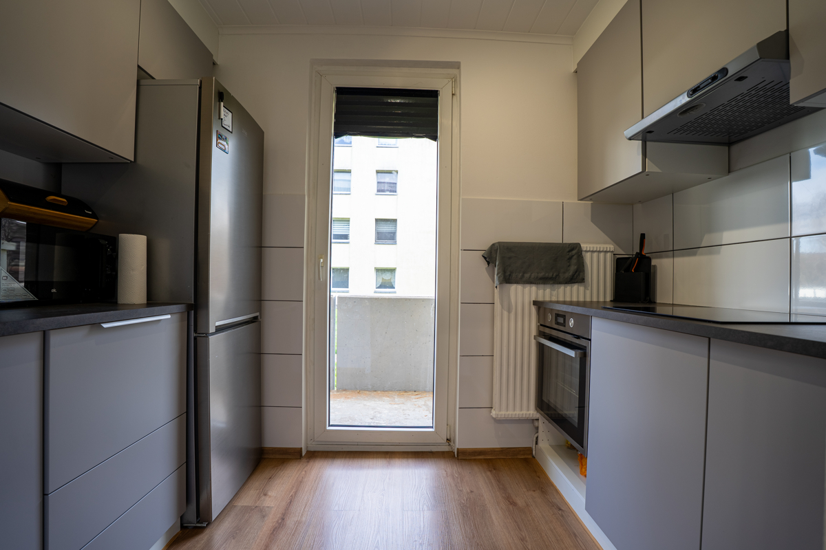 Der Balkon ist über die separate Küche zugänglich und bietet zusätzlichen Wohn- und Nutzkomfort. Der helle Wohnbereich sowie zwei weitere Zimmer eignen sich ideal als Schlaf-, Kinder- oder Arbeitszimmer.